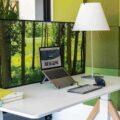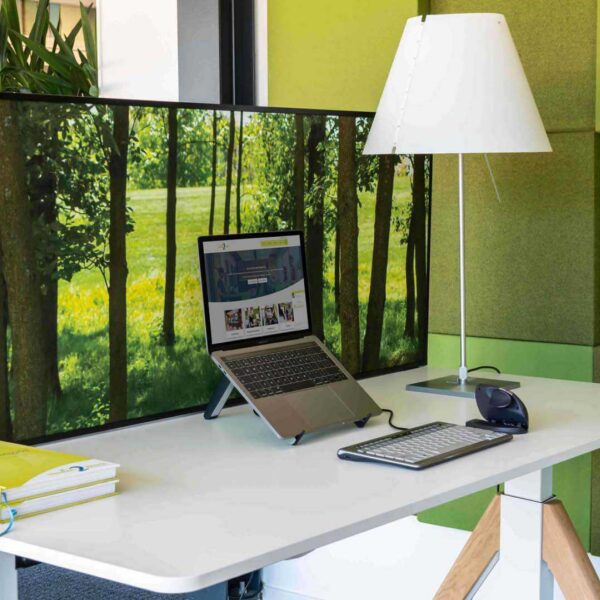 Een “hard interieur” heeft een lange nagalm en zorgt voor vermoeidheid en irritatie op kantoor. De vezels in dit akoestisch bureauscherm absorberen geluidsgolven, waardoor de nagalm vermindert. Bij het drukken van deze scheidingswand wordt gebruik gemaakt van een speciale inkt, die geen geluid weerkaatst. Bij de akoestische bureauschermen wordt een speciale techniek gebruikt, waardoor de inkt juist geluid absorbeert. De coating heeft hiernaast een slijtvaste laag. De bureauklemmen worden standaard meegeleverd.