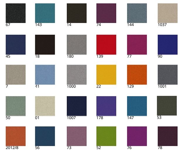 De panelen zijn opgebouwd uit een frame van 40mm berken multiplex en gevuld met gerecycled katoen voor een optimale geluidsabsorptie (absorptieklasse: A/NRC waarde 0,95). De stof MoVe en het gerecycled katoen zijn brandveilig volgens Euroklasse A2. Deze meubel- en paneelstof is verkrijgbaar in een zeer breed palet van 30 moderne kleuren, wat de stof breed inzetbaar maakt. De volgende kleuren zijn mogelijk: