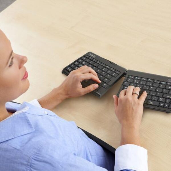 Vanwege het compacte design van de Goldtouch travel Go2 wordt de reikafstand naar de muis verlaagd. Hierdoor wordt de belasting van de schouders en onderarmen verlaagd.Tevens kan je als gebruiker geruisloos typen en heeft het de Goldtouch gesplitst toetsenbord een grote spatiebalk.