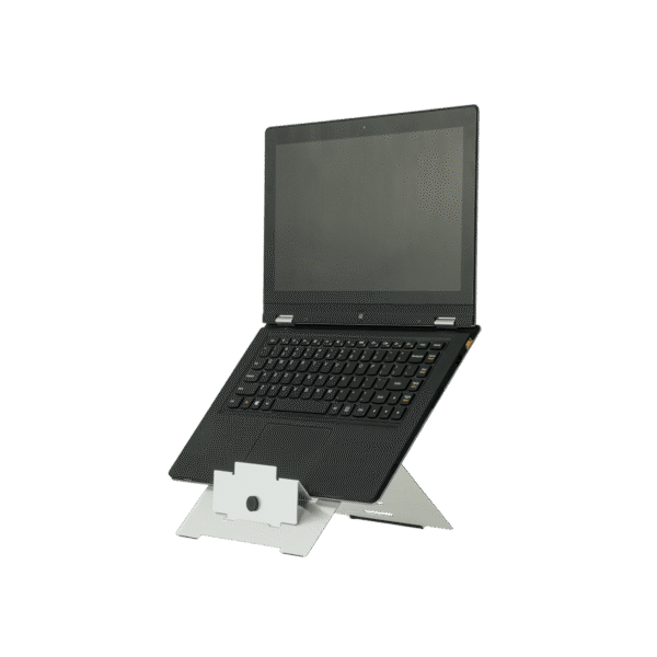 Flexibele laptophouder van lichtgewicht aluminium verstelbaar in 5 standen. Perfecte ergonomische laptopsteun voor thuiswerken en onderweg.