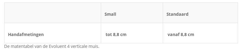 De handafmetingen in de tabel slaan op de breedte van de hand. Bekijk het 'Evoluent 4 handmaatformulier' voor meer informatie over hoe dit op te meten.