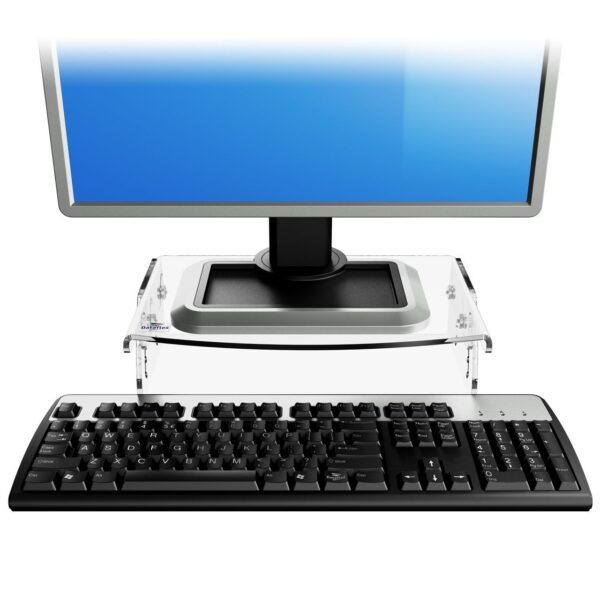 De Monitormate 200 II is vervaardigd uit 5 mm dik helder acryl, wat zorgt voor een stevige en stabiele ondergrond. Dankzij de heldere uitvoering blijft je bureau visueel licht — zonder zware metalen constructie. De maximale draagkracht van 15 kg garandeert dat ook grotere monitors veilig geplaatst kunnen worden.