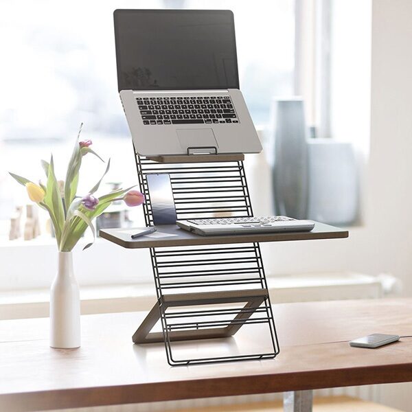 De Mousetrapper Standfriend is een lichtgewicht, inklapbare bureauverhoger. Je plaatst hem eenvoudig op je bestaande bureau en wisselt zo gemakkelijk tussen zittend en staand werken.