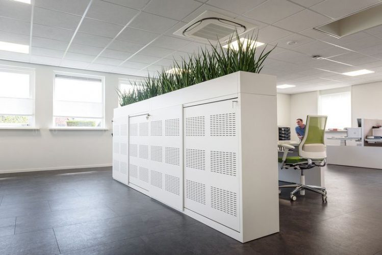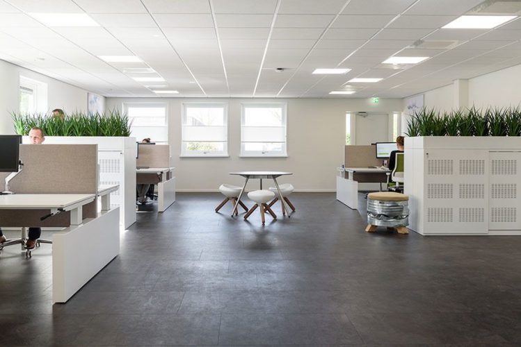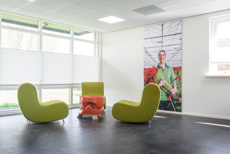 In het midden van de kantoortuin hebben wij een design zitje gemaakt van Lonq, bestaande uit drie krukken en een tafel. Hier kun je intakes doen of met collega’s koffiedrinken. De vorm van de krukken zorgt voor een zeer comfortabele zit.