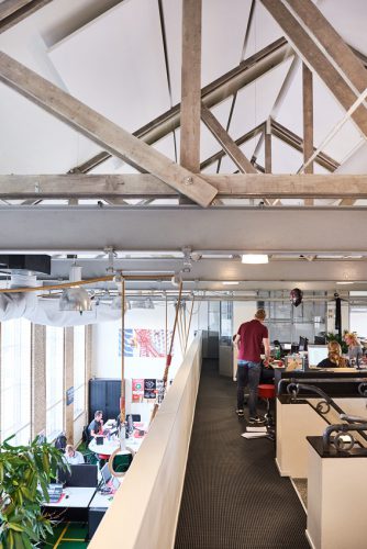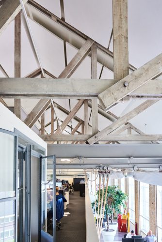 In alle drie de ruimtes hebben we gekozen voor witte akoestische plafondpanelen. In het kantoor hebben wij deze volledig in lijn met het dak en binnen de plafondbalken geplaatst, waardoor ze nauwelijks opvallen en de ruimte haar sfeer behoudt. In de conferentiezalen hebben wij ze onder en naast de luchtbehandelingskanalen geplaatst, zodat het industriële karakter niet verloren gaat.