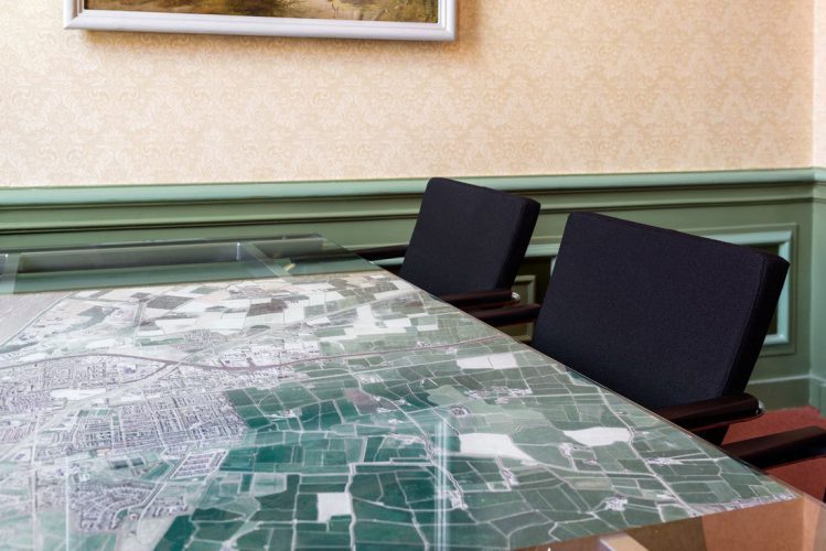 Voor de wethouder hebben wij een speciaal bureau ontwikkeld dat in hoogte instelbaar is en voorzien is van een glasplaat van gehard glas. Op de bijpassende vergadertafel hebben wij aan de onderkant van de glasplaat de luchtfoto aangebracht, zodat deze niet beschadigd. Zo kan de wethouder vol trots zijn gasten deze prachtige Gemeente laten zien.