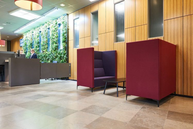 De ontvangstbalie met de verticale tuin – ook wel de Greenwall genoemd – is het hart van de ontvangstruimte. Uniek aan de balie is dat de bezoeker zelf de keuze kan maken voor een zit- of sta plek aan de balie. Daarmee is gemeente Ooststellingwerf één van de eerste gemeentes in Nederland, waar zowel de bezoeker als de medewerker de mogelijkheid heeft om aan de balie te zitten of te staan. Wij hebben dit uniek stukje maatwerk mogen leveren!