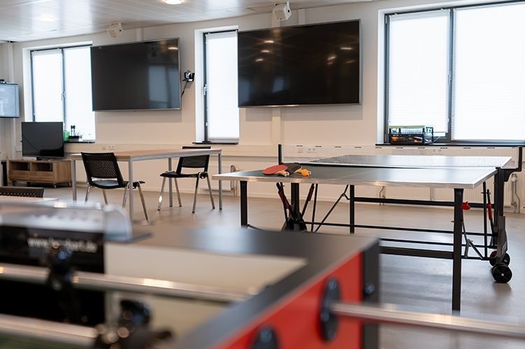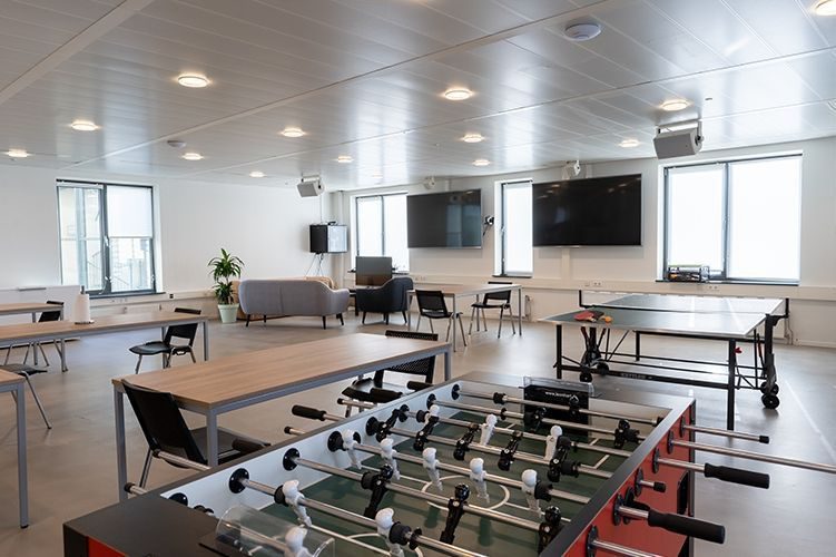 Bij de inrichting van het kantoor stond ook de verbinding van de medewerkers centraal vertelt Veltman – Bats. ‘Er is een grote ruimte gecreëerd, waar we een koelbuffet, tafels en stoelen en koelkasten hebben voor onze gezamenlijke lunches. In deze ruimte kunnen de medewerkers tevens tafeltennissen en tafelvoetbal spelen’ De achterliggende gedachte is het creëren van verbinding. ‘Er wordt op een andere manier contact gelegd met collega’s. De verschillende zitjes verspreid over beide verdiepingen zorgen ervoor dat een team kan overleggen op een minder statische manier dan wanneer men samen zit in een vergaderruimte.’