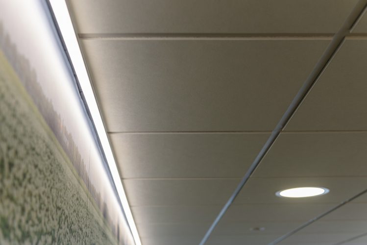 De verrijdbare banken met hoge rug, vormen de perfecte akoestische en visuele afscheiding tussen de multifunctionele ruimte en de pantry.