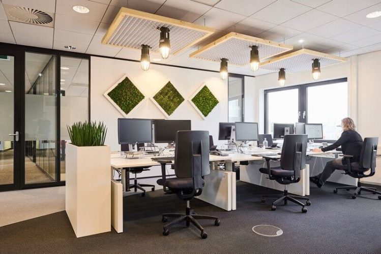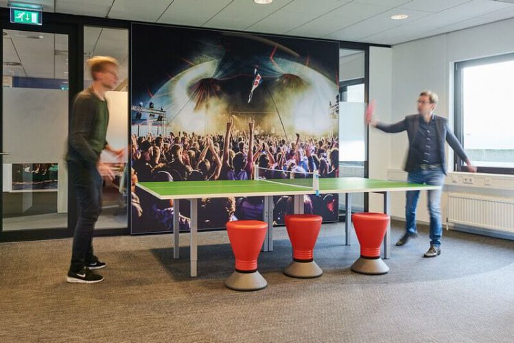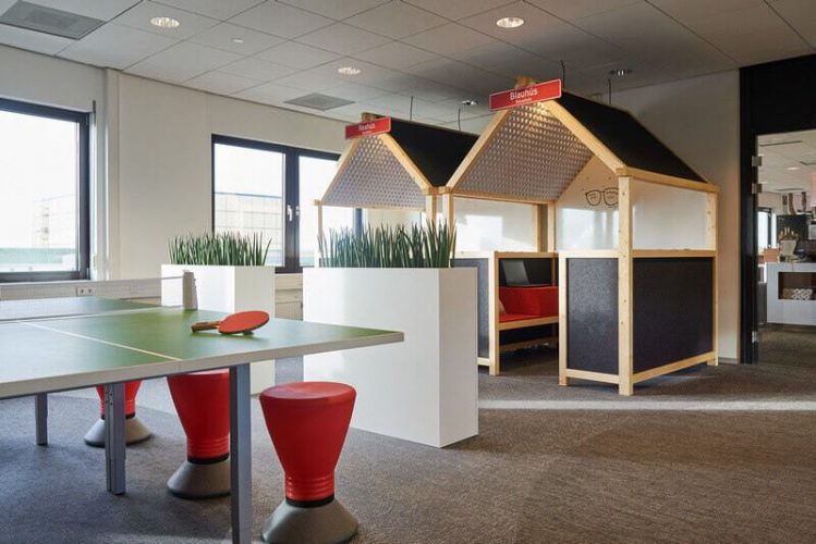 De akoestische werkhuisjes en plafonds zijn uniek in Nederland en gebouwd van volledig duurzame materialen. De huisjes komen tegemoet aan de behoefte van werknemers om in een open ruimte rustig te kunnen werken. De moswanden zorgen voor demping en een gezonder werkklimaat. De tafeltennistafel fungeert als vergadertafel en natuurlijk kun je er terecht voor een potje tafeltennis! Een groot succes onder de werknemers.