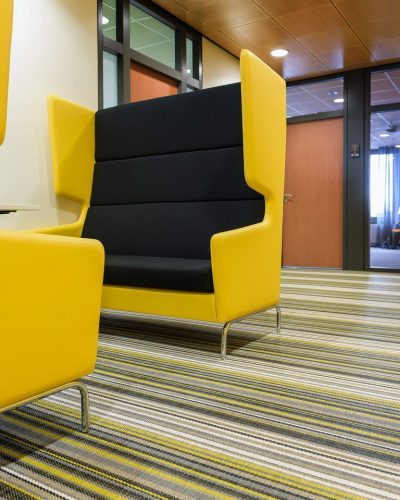 Het hoofdkantoor in Gorredijk is de afgelopen jaren volledig gerestyled, passend in de huisstijl. Hierbij hebben de accent en logo kleuren geel en zwart een prominente rol gekregen, wat onder andere tot uiting komt in het Bolon tapijt op de vloer. Passend bij de frisse en moderne uitstraling van dit snelgroeiende bedrijf.
